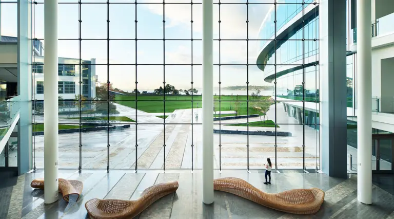 Glass Magazine Awards Judge Jacob Kasbrick, Guardian Glass Commercial Segment and Technical Services Manager, praised the project’s ingenuity in both engineering and energy performance. “Typically, a design like this would sacrifice performance for aesthetics. Being able to use a laminated IGU for the façade to meet [solar heat gain coefficient] and U-value in a cable net structured system is very impressive when you factor in all the load forces on the façade.”Engineering the right system for all the performance requirements was indeed a feat, say Sentech officials. “It was critical to balance the high amount of movement and flexibility inherent in pre-tensioned cable systems with the required deformation limits of the façade in order to maintain seals in the insulating glass. To address this, unique flexible edge conditions were designed and required to minimize panel warping, in order to ensure the IGU seals were not overstressed.” Accomplishing all of this demanded creativity and collaboration among Sentech’s internal teams, as well as external collaborators Benson, GLY and ZGF to install systems.