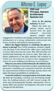 Sentech Architectural System’s CEO, Principal and Founder, Alfonso E. Lopez, P.E., was recently featured in USGlass Magazine’s latest issue as one of the glass and metal industry’s most influential leaders. The list features the industry’s most influential professionals, nominated by their glass and glazing industry peers, and then selected by the editorial team. Each nominee offers insight into their view of the industry’s greatest lessons, challenges, opportunities and wisdom.