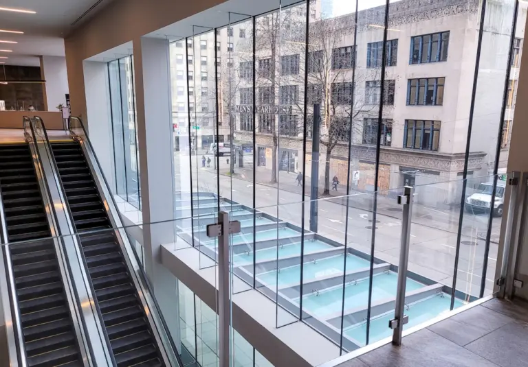 The base of the tower features several structural glass walls at the lobby elevation designed and engineered by Sentech, in collaboration with NBBJ. The structural glass fin walls and vestibule total over 2,500 square feet of low-iron, tempered insulated glass units, with the largest panels spanning close to 20 feet in height by 5 feet in width. The system utilized Sentech’s VetraFin-G Series. Some of the key challenges during the design and engineering phase of the project came from the relatively high seismic considerations unique to the Seattle region, and subsequent deformation conditions that had to be addressed in collaboration with the structural engineering team. As part of this effort, Sentech developed a system of slide bracketry that allowed 4″ of movement in either direction at the jamb conditions to accommodate building movement and avoid any clashes with the scope of structural glass walls.