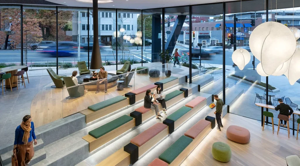 These 22-ft structural glass walls wrap the north and west facades at varying heights to create a transparent, inviting edge to this state-of-the-art life science hub. Precision-engineered stainless-steel toggles and vertical steel fins achieve a clean, frameless look, while high-performance low-iron insulated glass maximizes daylight and energy efficiency. The result is a bold, contemporary statement that enhances the public realm, connects interior spaces to the surrounding streetscape, and underscores the building’s LEED Gold commitment to innovation and sustainability.