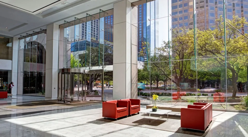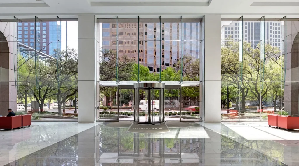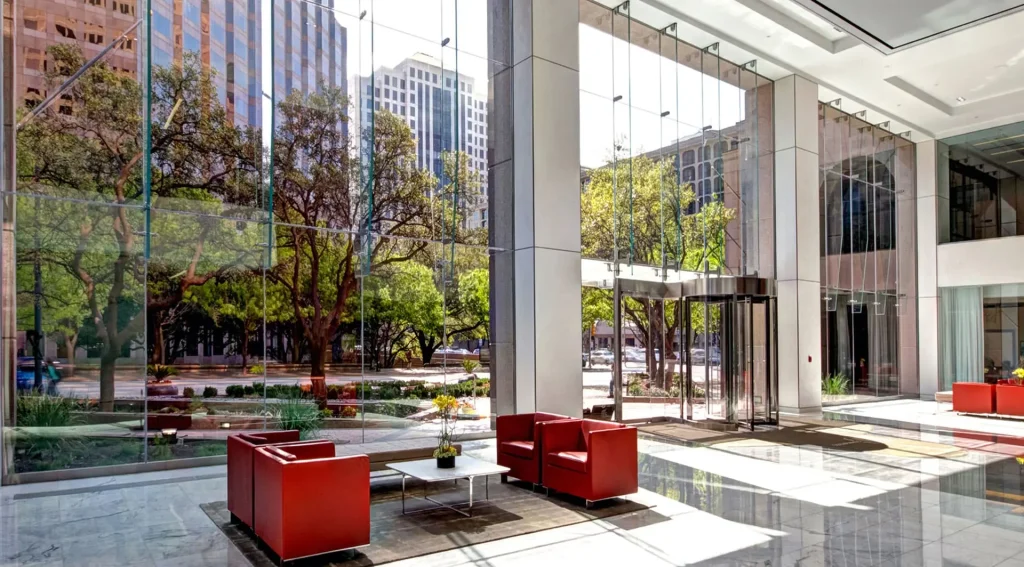 Located in the heart of downtown Austin, Texas, this LEED Gold certified, 22-story office building is one of Austin’s tallest and premier downtown office buildings. Originally developed in 1987, the high-rise at Congress Avenue and West Cesar Chavez Street overlooks Lady Bird Lake and is a landmark on the Austin skyline. The renovation of the first and second floors utilized Sentech’s VetraFin G-Series System with cantilevered fins, and the addition of the structural glass elements serves to maximize natural light streaming into the lobby space while offering unobstructed views- a gateway into the vibrant life of downtown Austin. The $6 million makeover and structural glass system has led 100 Congress to become a sought-after workplace destination by high-end legal firms and tech companies alike.