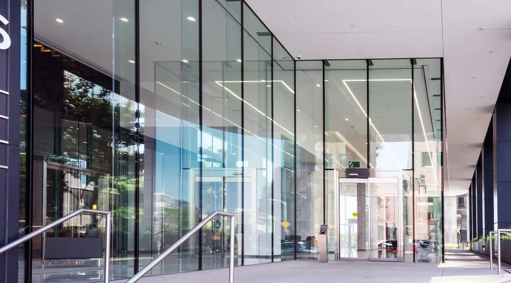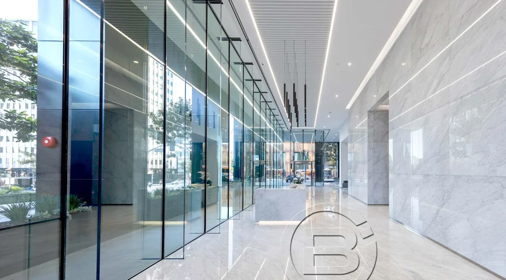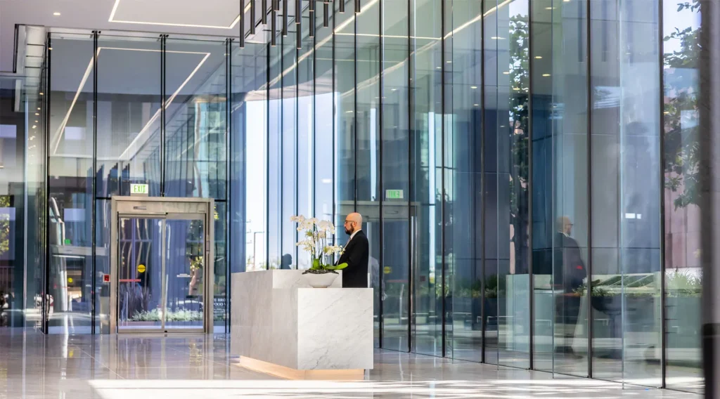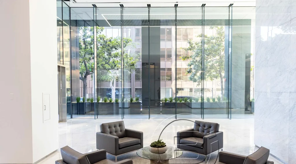 The lobby renovation and design was intended for a modern post-pandemic workforce that values transparency, natural light, access to culturally rich and dynamic environments, and sustainability. The selection of Sentech-supplied all-glass structural façades aligned with the design intent. In total, Sentech designed, engineered and supplied 12 exterior VetraFin-G insulated structural glass walls and 4 interior VetraSpan structural glass walls, totaling over 6,000 square feet of interior and exterior structural glass. Soaring more than 20 feet from sill to head without the use of any vertical support materials, the structural glass façades exude timeless elegance, serving as a connection point for visitors, tenants and the public alike.