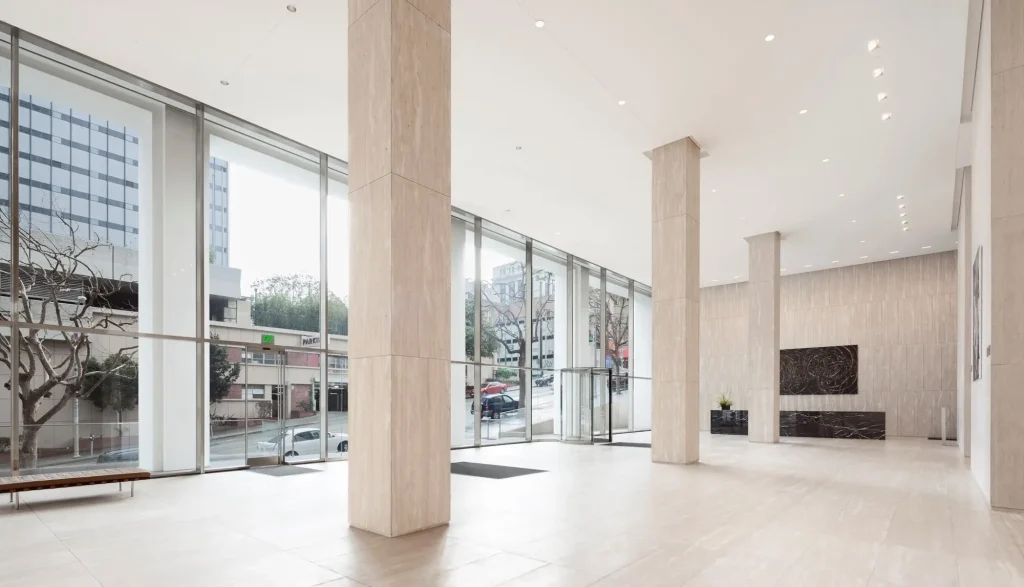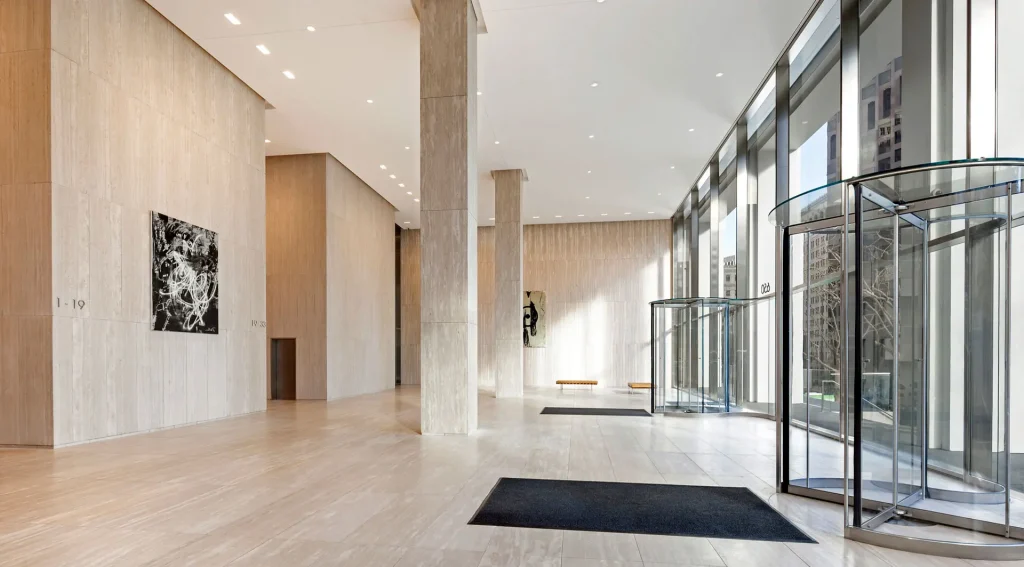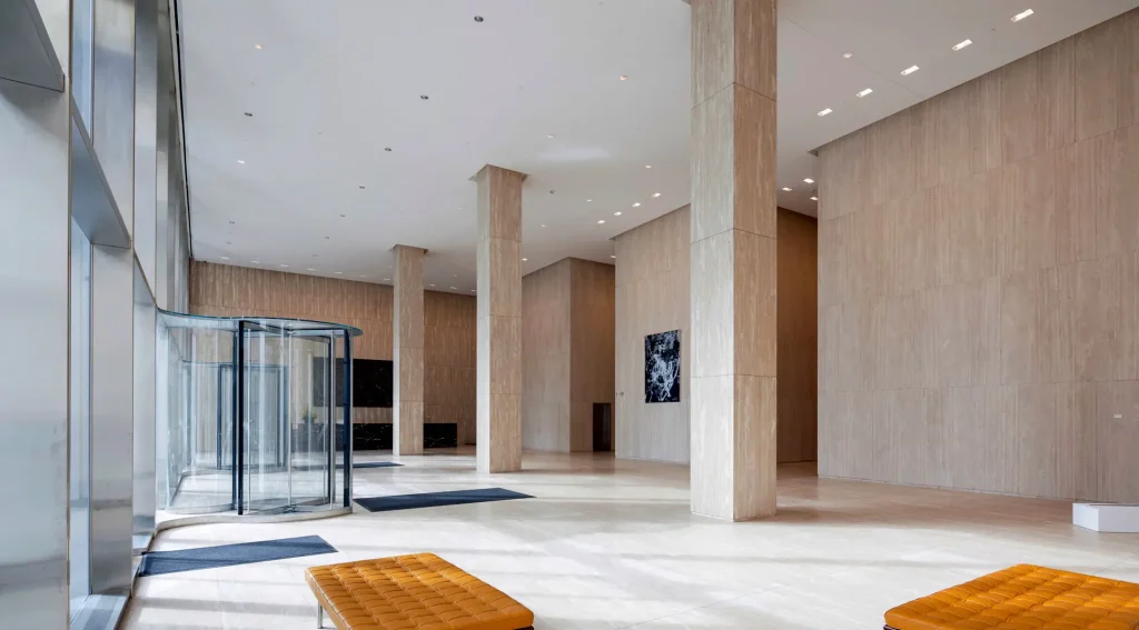 A 33-story office tower located in the heart of San Francisco’s Financial District, the recent renovation includes an enlarged entrance and a seamless, minimalist glass façade that brings more light into the space.