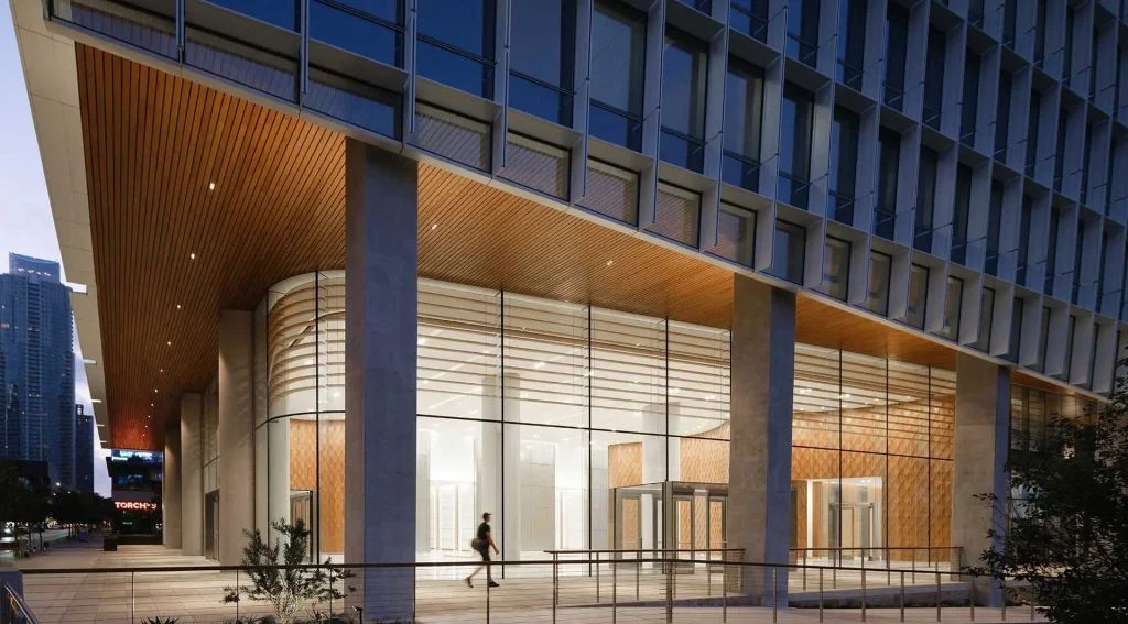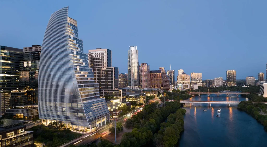 Completed in 2022, the building is also certified LEED Platinum. The building with its sail-like shape stands near Lady Bird lake and creates an impressive architectural statement blending seamlessly with its surrounding environment. The all-glass façade at the base of the tower illuminates the surrounding architectural landscape and it’s curved corners blend in perfection with the overall design of the tower.