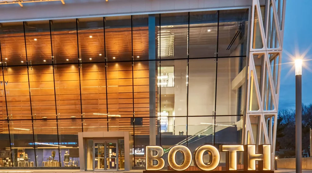 Boston University’s LEED Silver certified Joan & Edgar Booth Theatre is a design tour de force, and one of the top dynamic performance venues in the Boston area. The central inspiration for the design of the renowned theatre and its stunning glass façade was derived from a well-known quote from Shakespeare’s Hamlet: “To hold as ‘twere the mirror up to nature”. The artistic contemplation of theatre as tool a mirror to society influenced the design of the theatre’s spectacular, shimmering 42-foot glass façade that elevates BU’s presence on Commonwealth Avenue. Soaring 40-feet high and 112-feet in width, the striking façade utilizes Sentech’s VetraPatch Connection Series and VetraFin G-Series System and slants toward the street at a 14-degree angle, enclosing the 3-story high lobby. Reflecting back on Boston pedestrians and visitors alike, Booth Theatre’s elegant structural glass wall reaches out and invites the city into the award-winning cultural center, striking a glorious harmony between theatre and the society it mirrors.