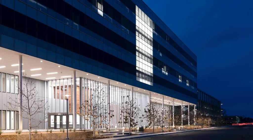 These structural glass façades create a stunning echo for the radiant Midland sunsets, with the 26-foot tall aluminum fins playing a threefold role as structural, shading and decorative elements.