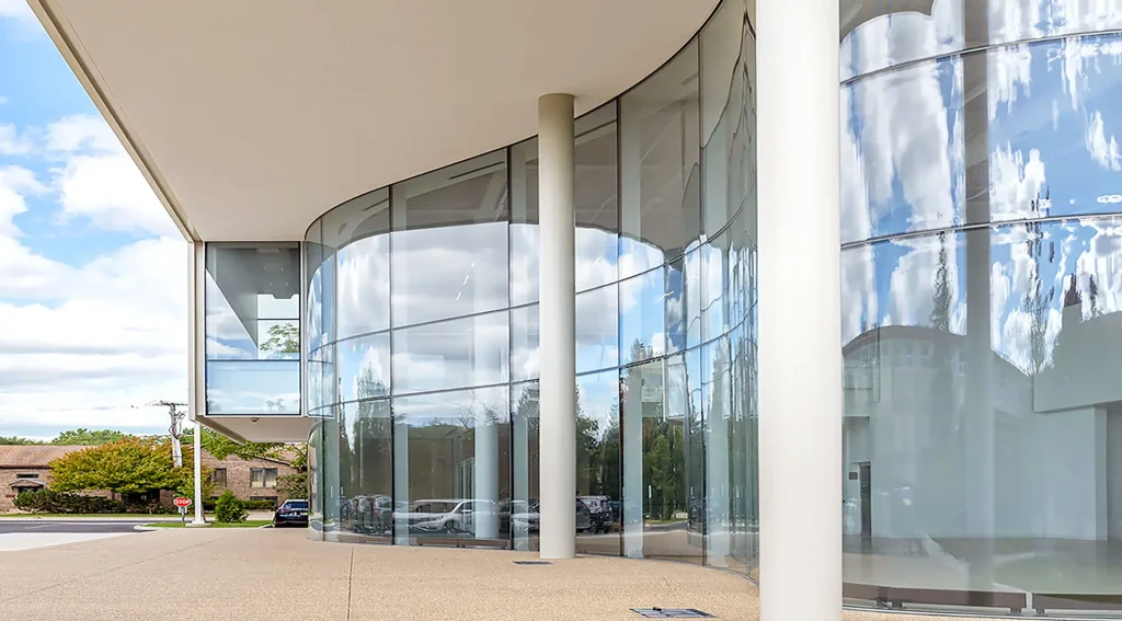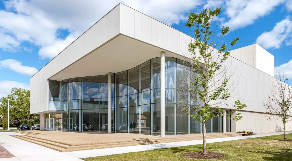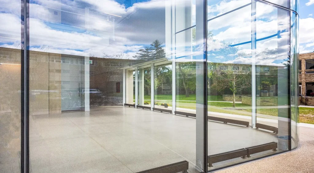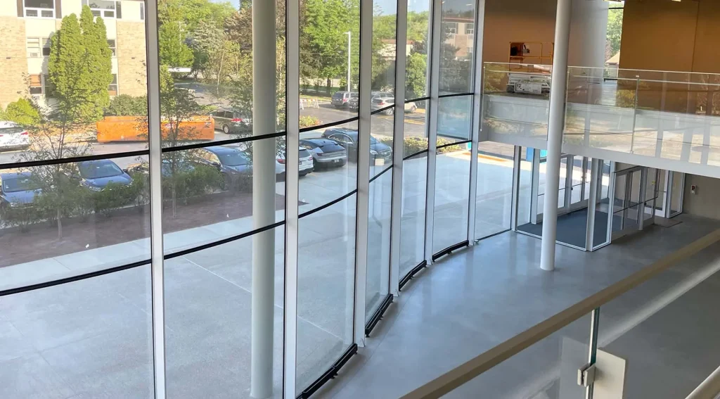 Featuring 29,000 square feet of integrated indoor and outdoor performance space, the new structure is highlighted by a dramatic, sweeping entrance lobby. Wrapping around the building in a wave-like fashion, the façade features a specialty Sentech VetraFin-S system designed with steel fins and low iron curved glass with a low-e coating to maximize the thermal performance and energy efficiency of the building. The design mandate called for a sustainable, open and approachable entry experience to foreshadow the activities inside by designing for an outward-facing character of the space, while rooting the Performing Arts Center into the heart of the campus and incorporating the exterior environmental connection. This was accomplished through the selection of a state-of-the-art, 125-linear-foot undulating curved glass façade that blurs the line between the indoor and outdoor spaces. Elegant, full-height steel fins create a visual elongation of the height of the façade, which rises just over 28.5-feet at its highest point.