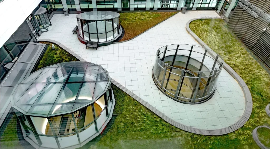 The AIA award-winning Edward A. Brennan Entry Pavilion, a dramatic three-story entrance way linking the new hospital to existing buildings, serves as Rush University’s new front door. The terrarium is encased in a display that pays tribute to those who have made Rush an extraordinary place of healing, showcasing an open-air cone-shaped glass terrarium that pierces the ceiling, infusing the lobby with natural light and illuminating the landscape open to the elements above. The resulting structure brings the outside in and exemplifies advances in structural glass design technology.