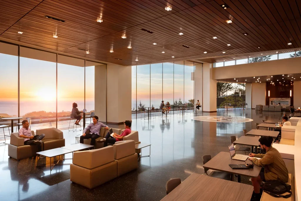 The award-winning Environmental Science Building (B12N) at Skyline College in San Bruno, California offers one of the most spectacular, expansive views of California’s Pacific Coast with its stunning, 22′ jumbo clear span glass façade. The first building at Skyline College with a view of the Pacific, the space creates a shared locus for educational activity and community events. The main gallery, with its expansive views of the California coastline is intended to support community and enterprise functions, along with student art displays.