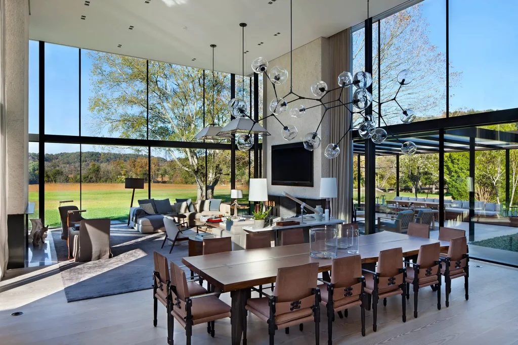 This expansive Tennessee farmhouse residence, designed by NYC-based Meyer Davis Studio, was conceived as a modern interpretation of a hunting lodge using clear span walls. Transparency was the primary goal in all design considerations to ensure an intimate connection between the homeowners and the striking landscape surrounding the property, and Sentech’s VetraSpan Clear Span System was used to achieve that design mandate. This structural glass application is unique in that the glass panels support themselves, and this structural glass systems does not utilize any out-of-plane support.