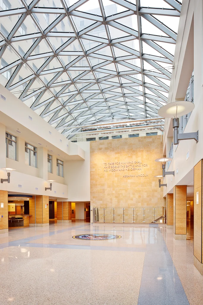 The Veterans Affairs’ design mandate was to flood the lobby with natural daylight, creating a bright and welcoming environment for patients, visitors, and staff. This design not only enhances aesthetic appeal but aligns with the building’s overall focus on healing architecture and energy efficiency. The Consolidation Building is registered for LEED-NC V2.2 certification with the U.S. Green Building Council. The design includes expansive use of natural finish materials including wood wall coverings and stone and terrazzo flooring.