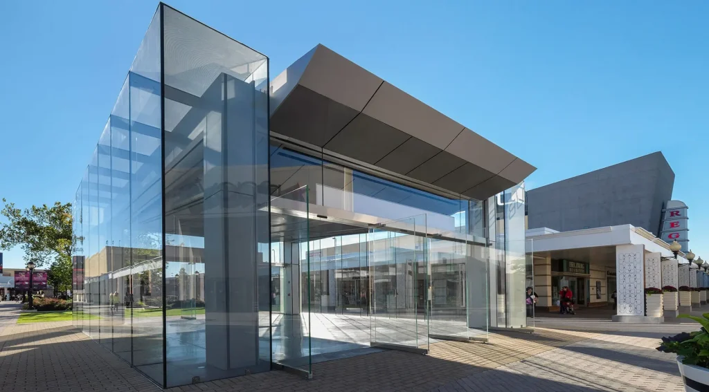 An open-air, upscale shopping center in Skokie, Illinois, Westfield Old Orchard Mall is the third largest mall by total square footage in Illinois. With the aim of creating a minimalist statement structure that could be utilized in both cold and warm weather months, this completely transparent, freestanding 1,300 square-foot glass pavilion was designed as an innovative space for product launches, exhibitions and as a backdrop for the summer concert series. Sitting at the intersection of three main promenades, the glass cube features 20-foot tall glass fins utilizing Sentech’s VetraFin G-Series System. To meet the design mandate of complete transparency, the structural system was made nearly invisible. The structure is supported on just four steel columns, inset at each corner, with stainless steel plates embedded into the fins at the roof to support the roof glass and transfer the façade loads to the main structure. The oversized, low-iron, anti-reflective glass panels were laminated with an interlayer for added strength while bearing on an embedded channel at the base, and are supported by structural fins joined to the panels with structural silicone. The bespoke connections and seamless, strategic structural design result in a minimalist elegance that opens the space to the outdoors while acting as both destination and gateway.