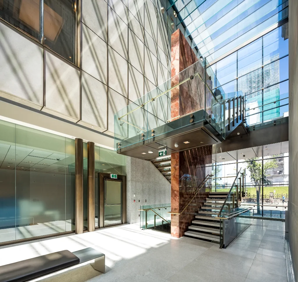 Sentech’s VetraFin glass façade enhances the 2-story lobby with openness and natural light, using over 13,530 square feet (1,255 square meters) of structural glass, including vestibules and elevator enclosures made from low-iron, laminated glass. The precision-engineered cantilevered glass fin wall, suspended from level 3, ensures seamless integration with the tower’s modern design while accommodating deflection and maintaining strict elevational tolerances.
