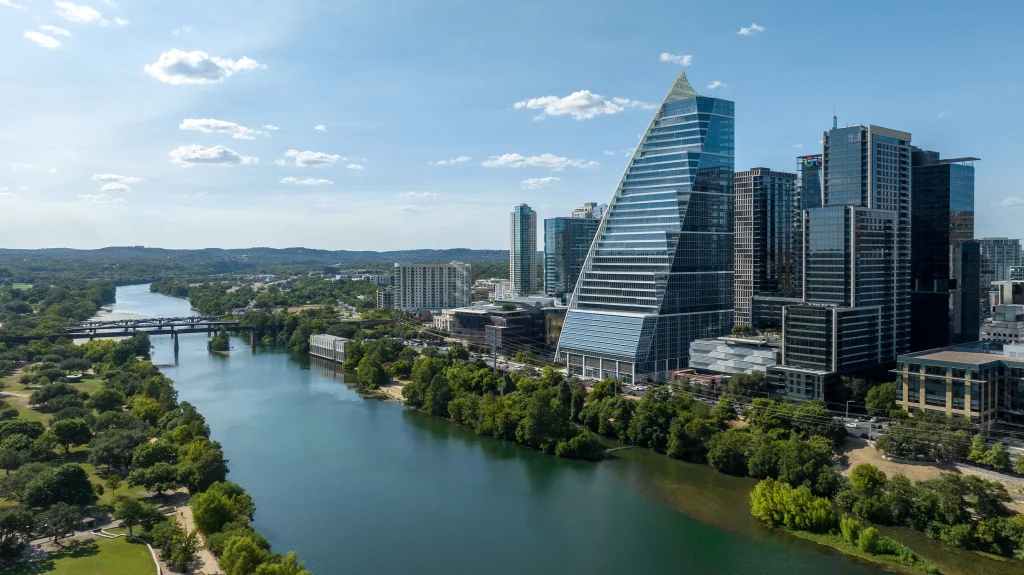 Block 185, known as Austin’s “Google Tower,” rises 35 stories with a sail-like design that emphasizes creativity, transparency, and openness. At its base, the building features Sentech’s VetraFin-G System, a structural glass façade supported by glass fins, using approximately 2,769 square feet of low-iron tempered insulated glass with SGP laminate and curved panels.
